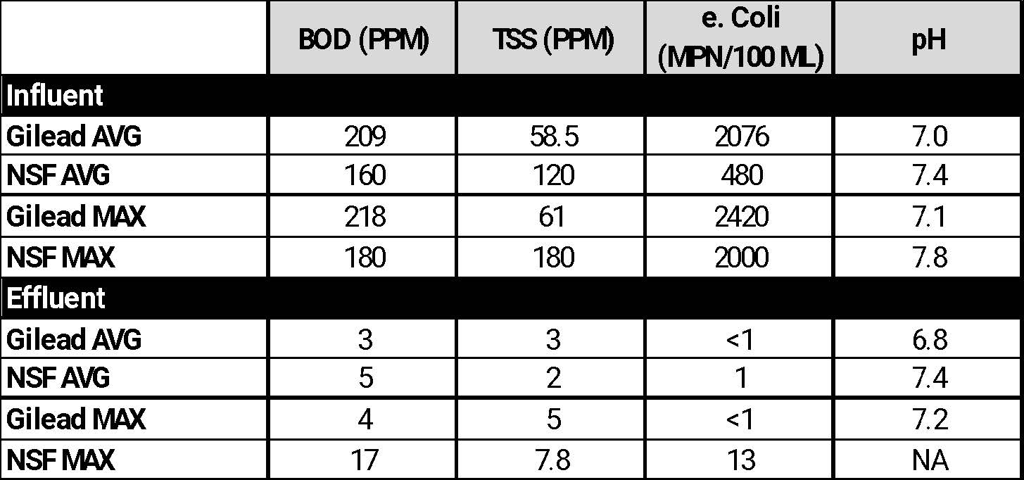From October 2023 through April 2024, monthly grab samples were taken for key water quality parameters. Here is a table of results which compare influent and effluent water quality for the Gilead system as well as data from the 2016 Aqualoop NSF 350 certification test.