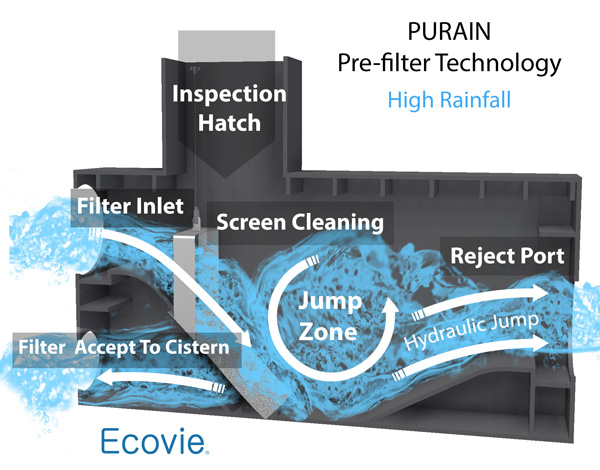 If a rainwater pre-filter is sized to handle water for all rainwater, including, for example, 100-year rainfall intensity, then the filter will be very large, and most of the time it will not perform well. All types of self-cleaning filters for the PURAIN jump filter, to other cascade filters, to the spinning vortex style, will not perform at their best if oversized. Excess capital may be spent on installing bigger and more filters than are necessary, and water capture and self-cleaning will not be optimum.